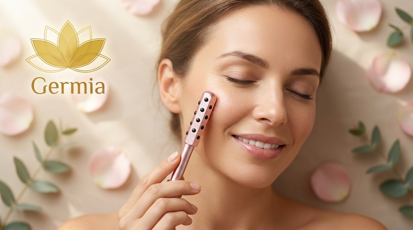 Le roller visage Germia, doté de 24 billes de massage contenant du germanium, transforme chaque application de soin en un moment de détente immédiat.